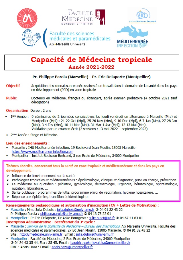 Ces partenariats mettent en jeu plusieurs universités de l’infectiopôle Sud. Ainsi, les enseignements en « Anthropologie du sida » sont réalisés dans le cadre de collaborations entre l’Université de Montpellier et l’Université d’Aix-Marseille (au sein de l’UMI 233), et en partenariat avec le RAF VIH (qui fédère une dizaine d’universités et instituts de formation africains).