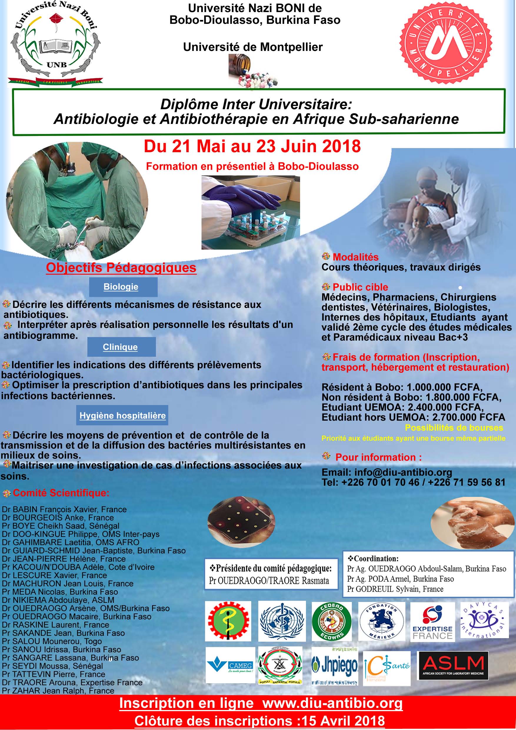 - Université Nazi Boni de Bobo-Dioulasso : DIU Antibiologie et Antibiothérapie en Afrique Sub-saharienne