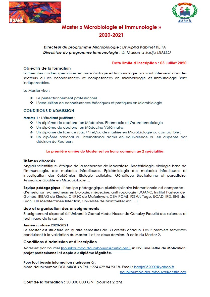 - Université Gamal Abdel Nasser de Conakry : Master Microbiologie et Immunologie ( http://master-microbio.com/presentation/)