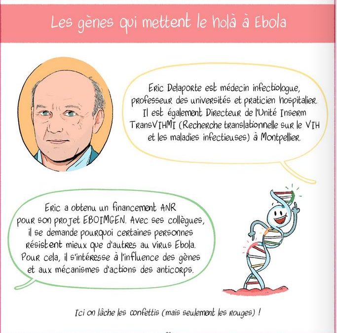 Le professeur Eric Delaporte a participé à ce projet de bande dessinée. Il y explique son projet EBOIMGEN Immunological and genetic determinants of the response to Ebola virus infection.