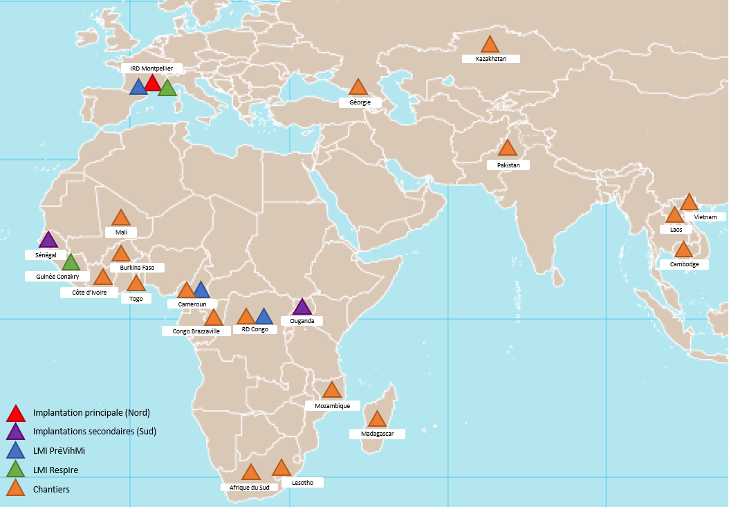 Outre son implantation en France, l’unité a un rayonnement international. L’ouverture, à partir des sites d’implantation ancienne (Sénégal, Cameroun, Burkina Faso) vers de nouveaux partenaires en Afrique (Ouganda, Côte d’Ivoire, Guinée) et en Asie (Laos) permet d’élargir les analyses comparatives, réalisées de plus en plus souvent dans le cadre de collaborations Nord-Nord-Sud-Sud (EDCTP, Réseaux internationaux, ANRS).